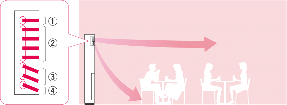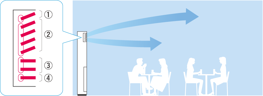 ①②のルーバーを上向きに、③④のルーバーを水平に調整して、温度ムラを低減。
