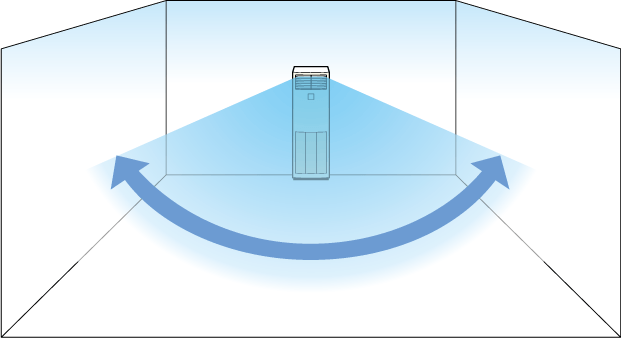 室内機を壁面中央部に設置時は、前方の左右へワイドに送風。