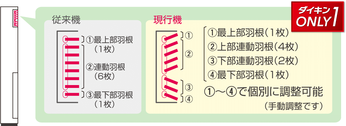 8枚のルーバー(水平羽根)操作で上下吹き分けを自在に選択。